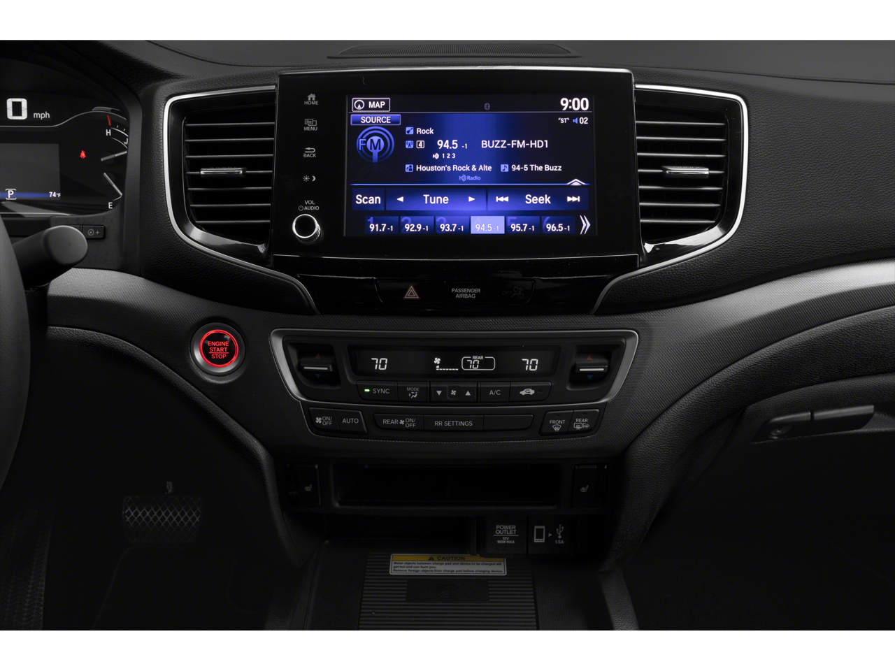 - Radio: 540-Watt Premium Audio System w/8 Speakers -inc: subwoofer, Bluetooth® streaming audio, MP3/auxiliary input jack, Radio Data System (RDS), Speed-Sensitive Volume Compensation (SVC), 8" display audio w/high-resolution electrostatic touch screen and customizable feature settings, Apple CarPlay integration, Android Auto integration, HondaLink, SMS text message function, 1.5-amp USB smartphone/audio interface in front console (1 port), 2.5-amp USB charging port in center console (1 port), HD Radio, truck-bed audio system and wireless phone charger