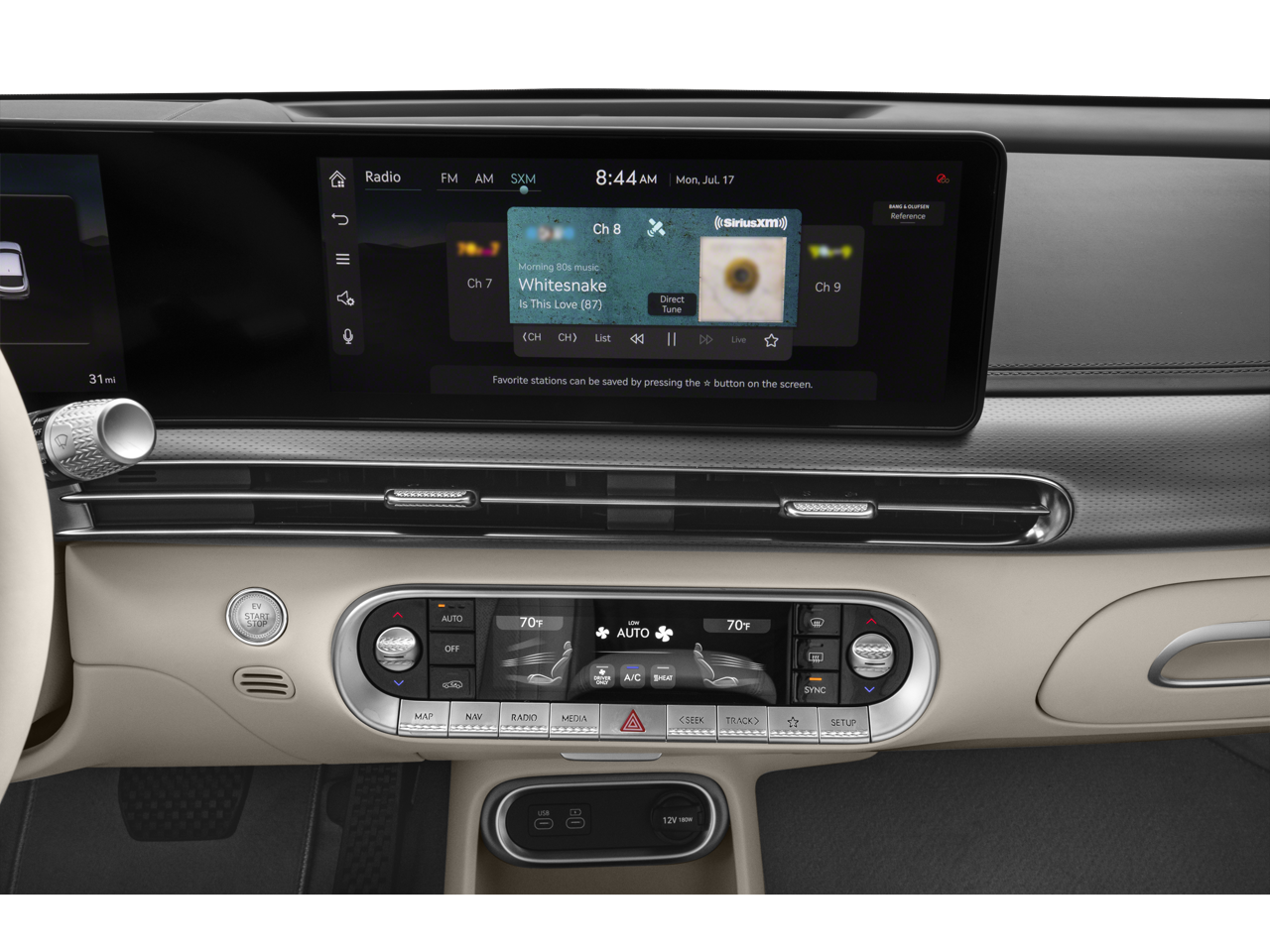 - Radio: AM/FM/XM/HD Bang & Olufsen Premium Audio System -inc: 12.3" HD LCD display screen, navigation system w/cloud connected platform (cloud profiles, connected routing, dynamic voice recognition and OTA updates), head up display, SiriusXM Radio, 17 speakers, 14-channel amplifier w/1,400 watts max output, road active noise control, Apple CarPlay and Android Auto, Bluetooth hands-free phone system w/audio streaming, Genesis Connected Services, 4 USB ports and 12v power outlets